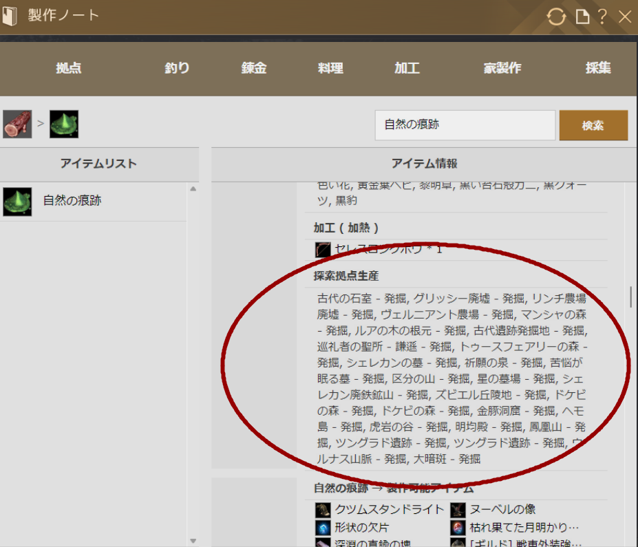 いきなり情報が飽和していますが、「発掘」という拠点からは全て採集できると思ってください。(以前は痕跡にもいろいろ種類があったので、このように場所が多いのです)