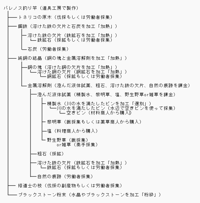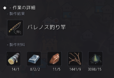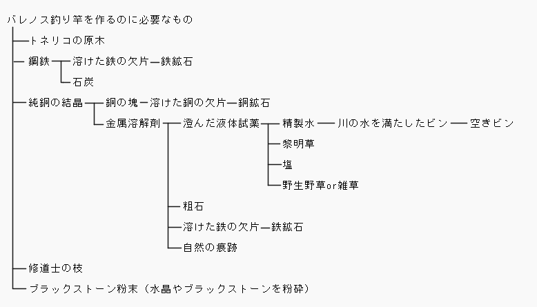 バレノス釣り竿1つを作るには、「トネリコ原木1、鋼鉄2、純銅の結晶5、修道士の枝9、ブラックストーン粉末15」が必要です。
