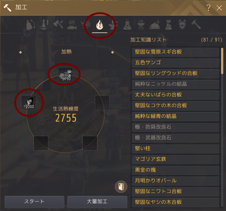 加工で「大量加工」などをするときにも使える手です。(凝縮された魔力のブラックストーンを100個作りたい時、先の尖った黒結晶の欠片100とブラックストーンを適当に持って、大量加工で加熱する等)