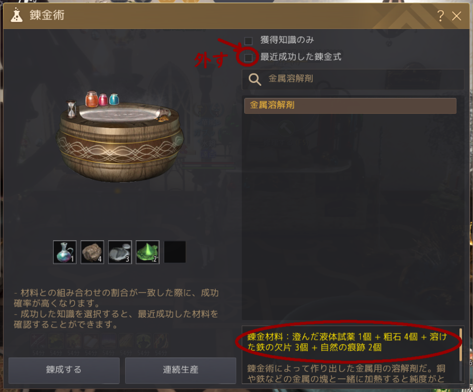上の検索欄から「澄んだ液体試薬」なり「金属溶解剤」なり入れて検索する(最近成功した錬金式のチェックは外す)とレシピがでるので、その配合にしたがって材料を入れてください。