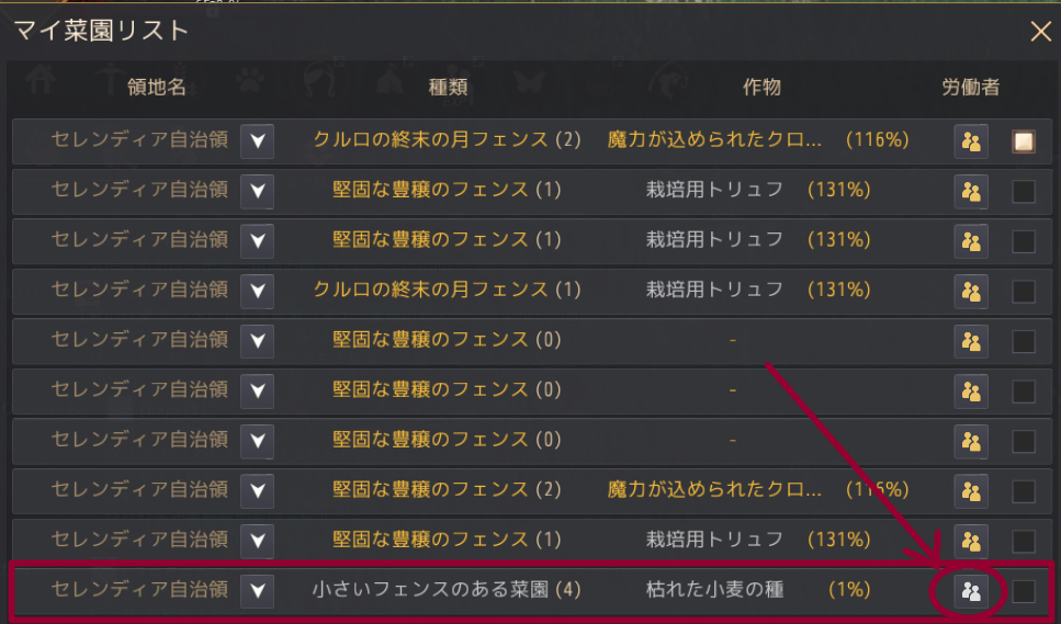 人型が白いところは労働者派遣していない畑なので、ここを押して