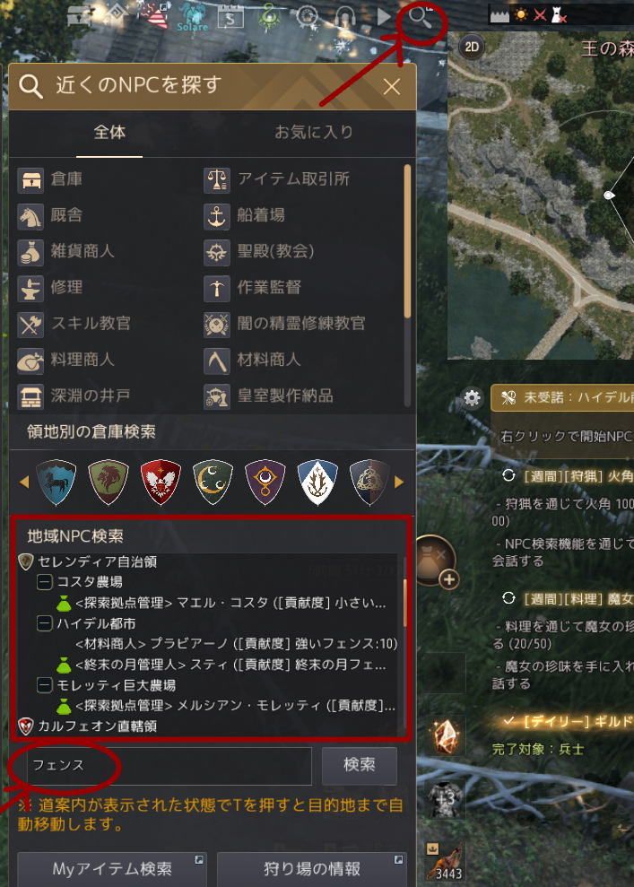 の3種類があり、通常画面右上のルーペアイコン、もしくはESCメニュー→便利→NPC検索から、「フェンス」で検索すると貸してくれるNPCが表示されます。