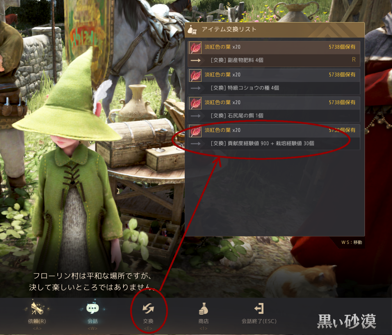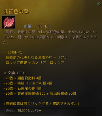 この副産物「淡紅色の葉」をリアナのところに持っていって、栽培経験値+貢献度経験値と交換。