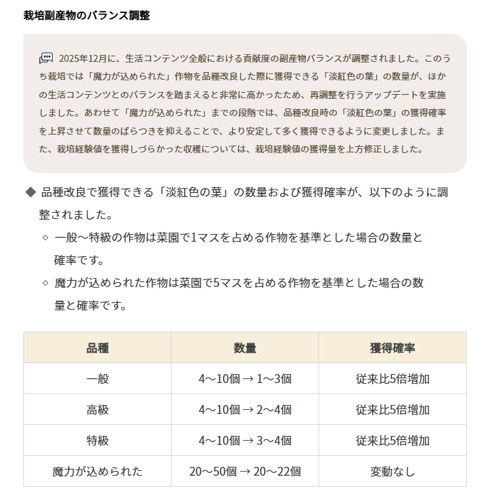3月4日のアップデートにより、栽培副産物の採れる量が下方修正されました。