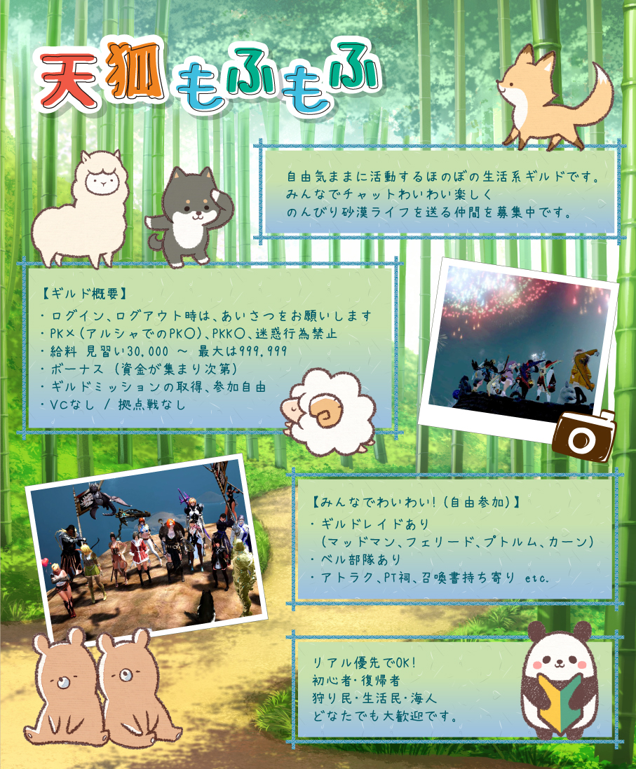ゲーム内【Gキー】→【ギルドメンバー募集】→【生活】→【天狐もふもふ】で検索 →【加入申請】をお願いします。