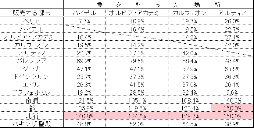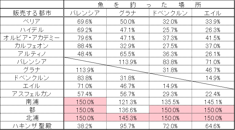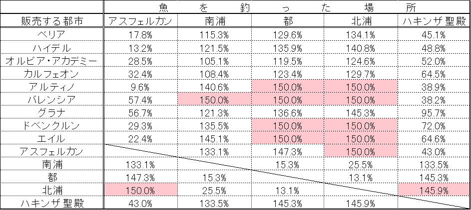 以下の表は1行目が釣った場所、左端が売る場所で見てください。