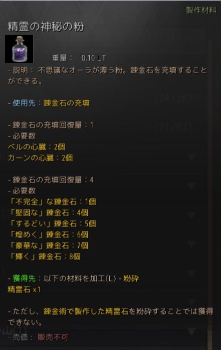 まず、どの素材でも錬金石の充填に必要な個数は同じです。個数に関しては精霊の神秘の粉の画面に書かれており、下の画像のようになっています。