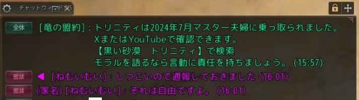 内容は事実で問題は継続している。個別の事案などに対してはそれぞれの背景や経緯を総合的に判断して対応するのでは?に対し、お客様への制裁におかれましては、あくまでチャット内容からの利用制限であります。冒険者様が訴えられている該当ギルドに関する内容そのものにおきましては、調査を行ってほしいと訴えをいただいておりますお声のもと、本件の担当部署にて確認・調査を進行させていただきます。