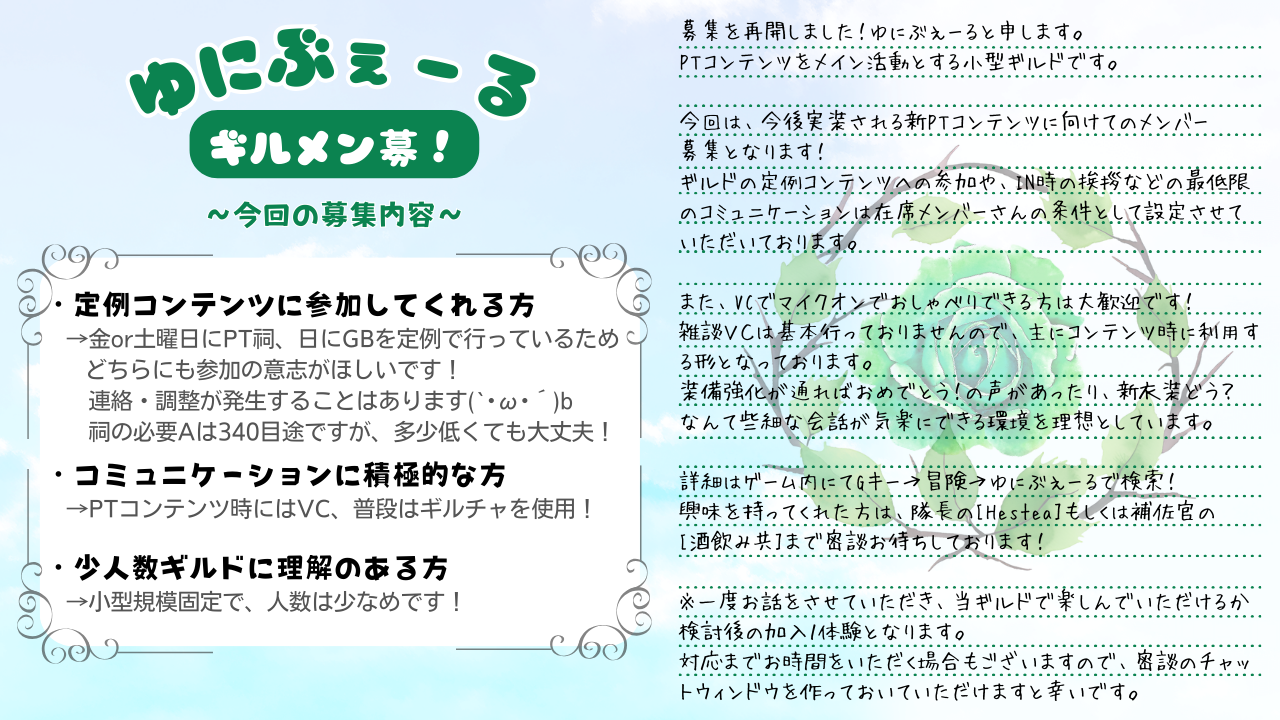 みんなで一緒に遊べるコトと、ここまでギルドについてきてくれる人を大事にしているギルドです。