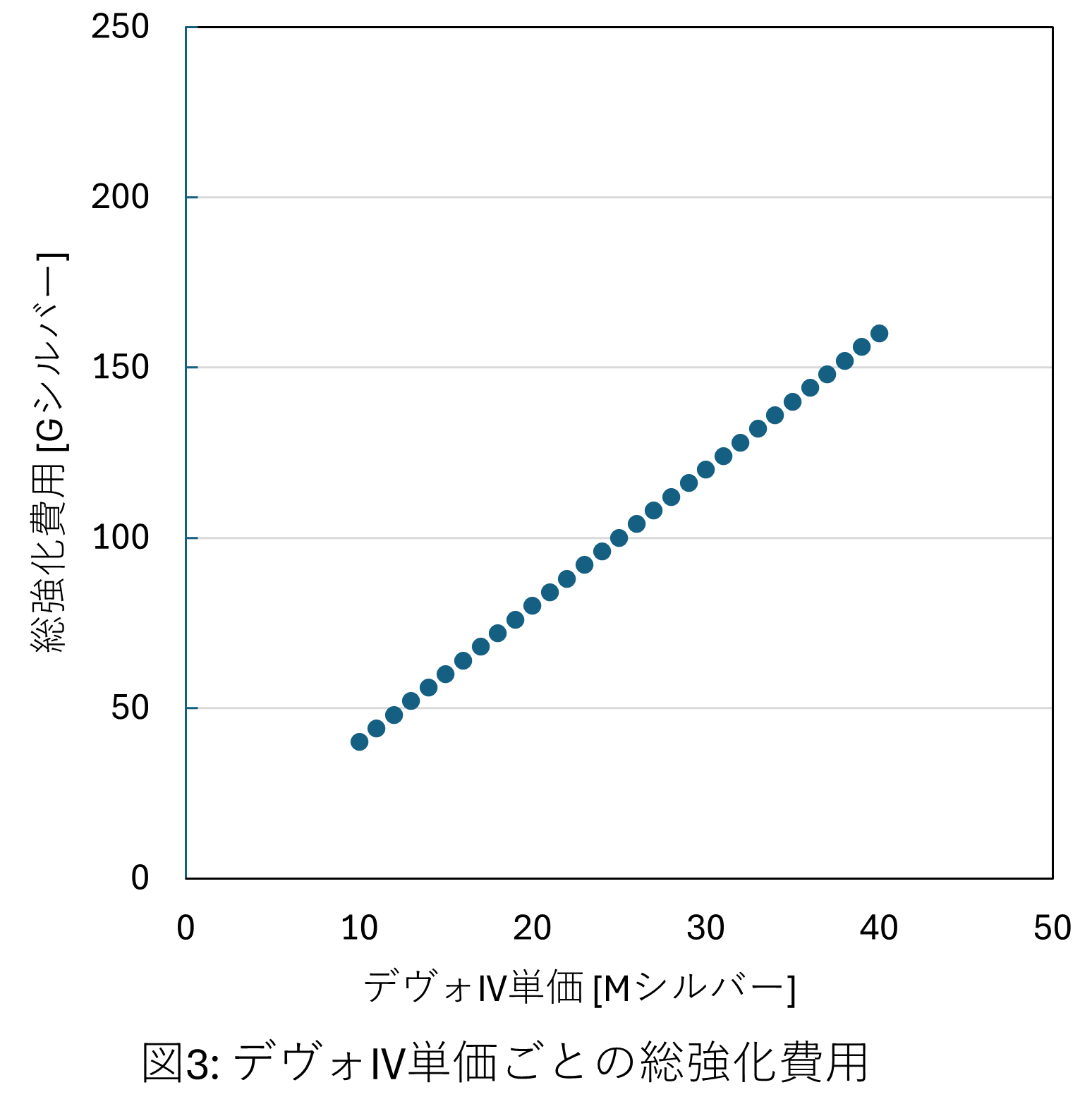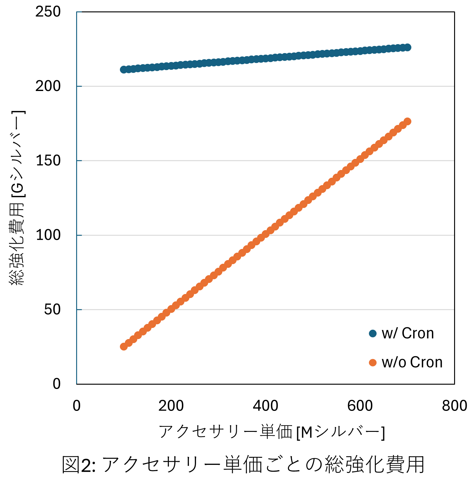 計算した範囲(未教化デヴォレカアクセ単価100-700M/個)ではクロン石を使用した強化は必ず割高