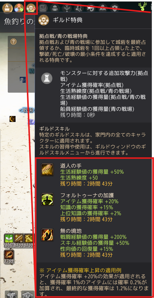 画面上部の「ギルド特典」アイコンにカーソルを合わせると以下のバフの状況を確認できます。