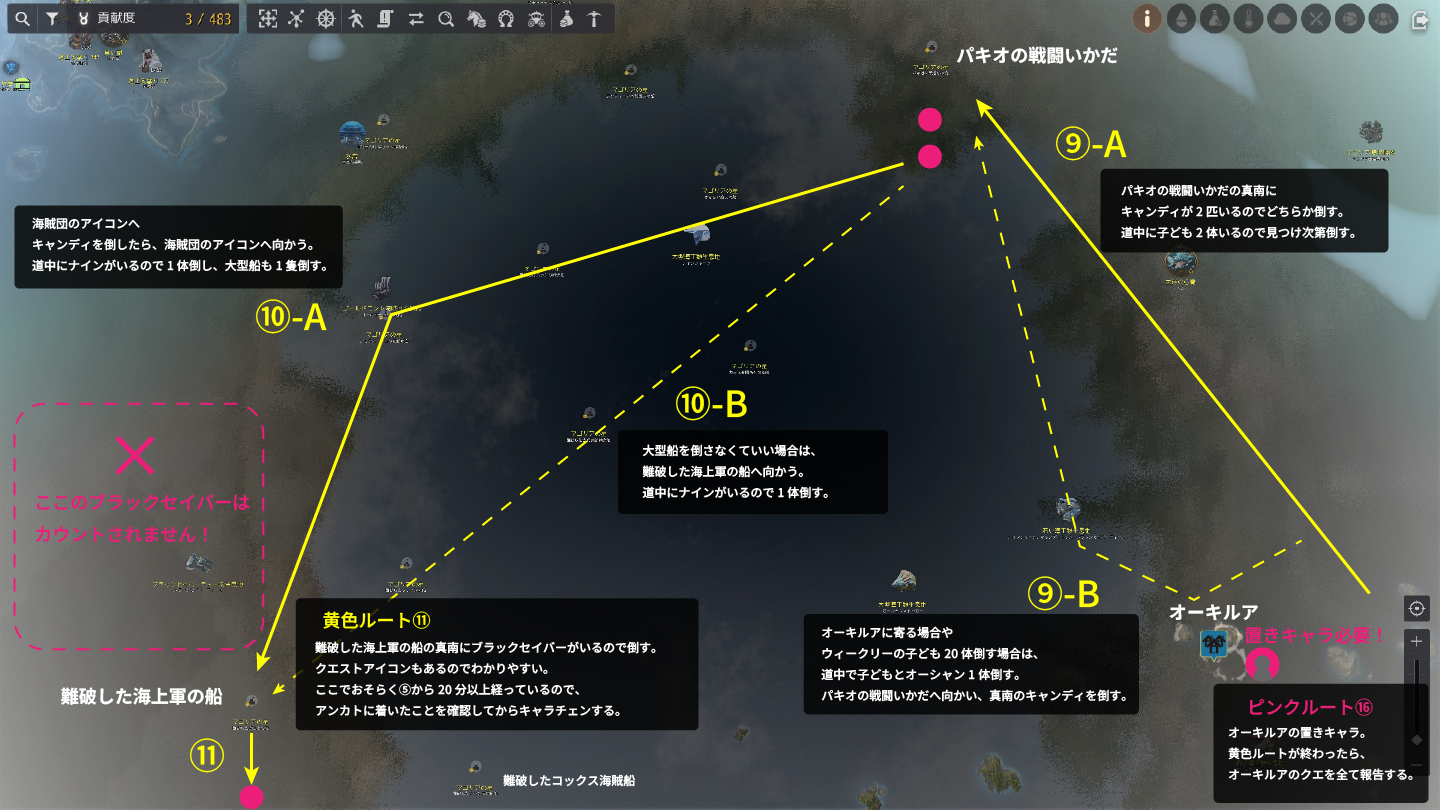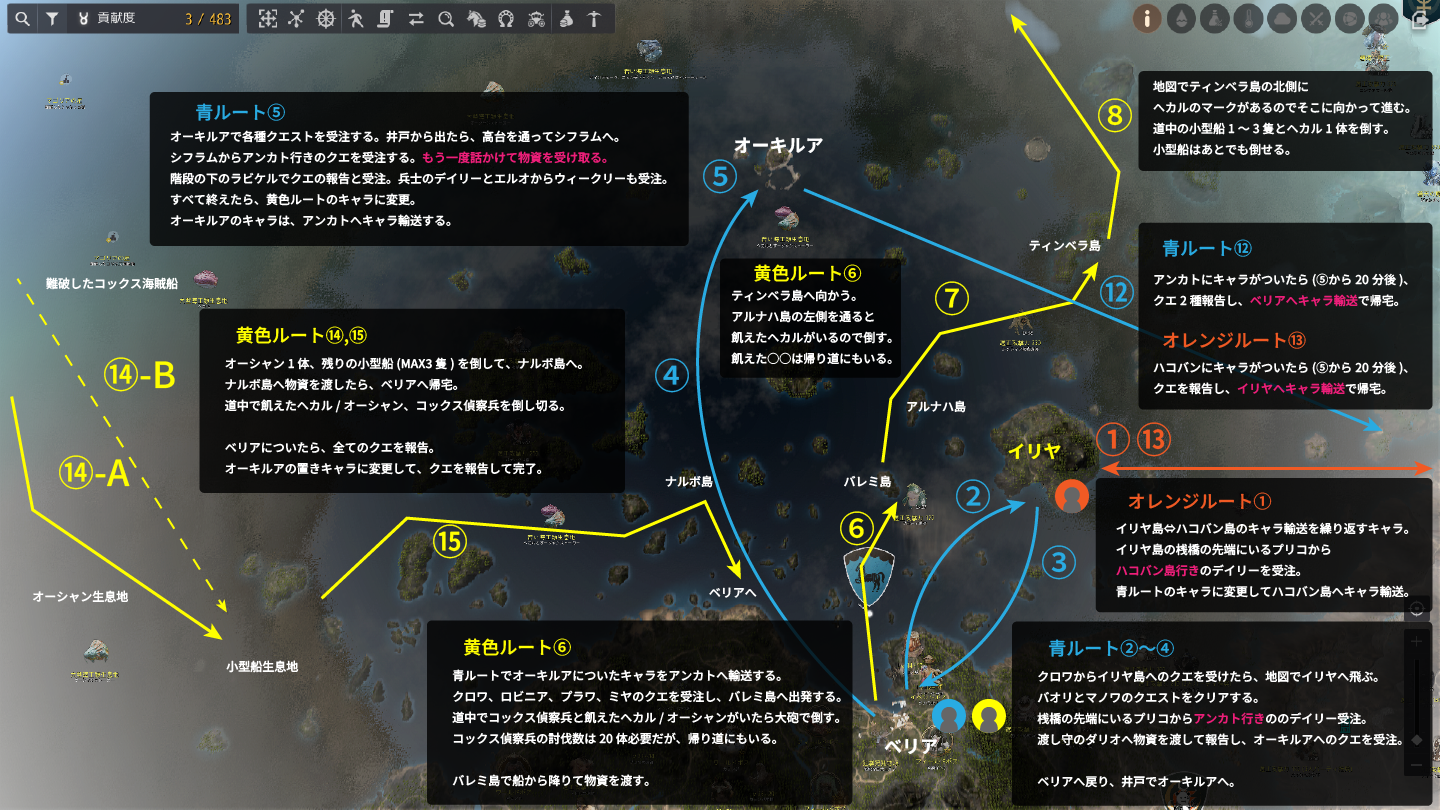 しかし、青ルートのキャラはオーキルア→アンカトと毎日周る必要があるので、2日分の荷物を持たなくても大丈夫です。
