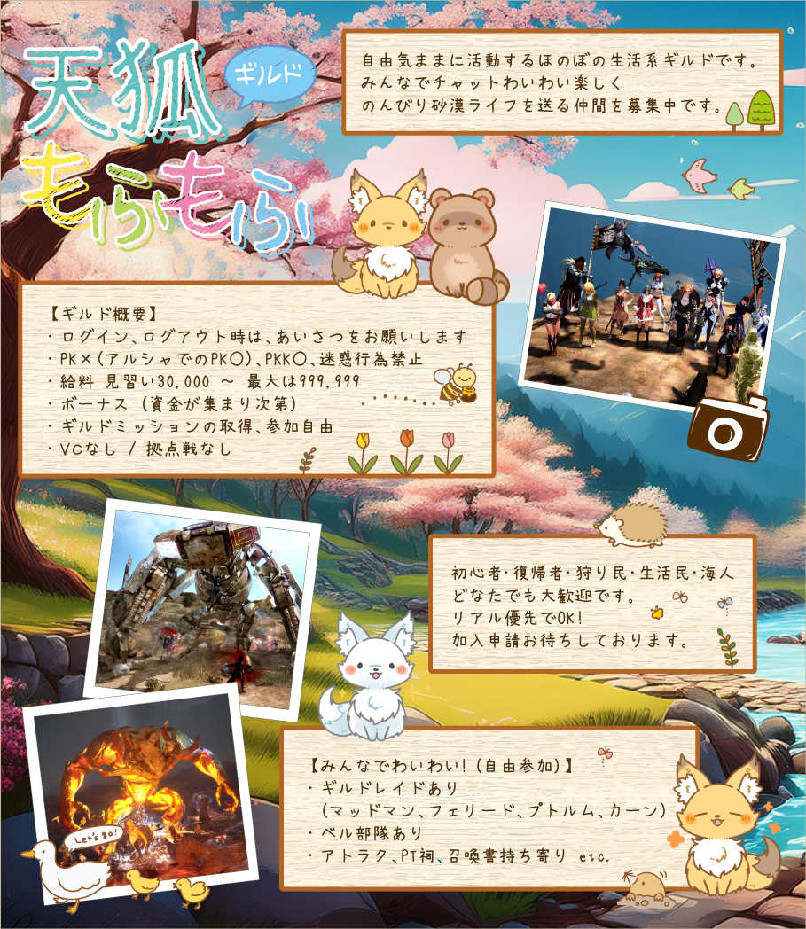 ゲーム内【Gキー】→【ギルドメンバー募集】→【生活】→【天狐もふもふ】で検索 →【加入申請】をお願いします。