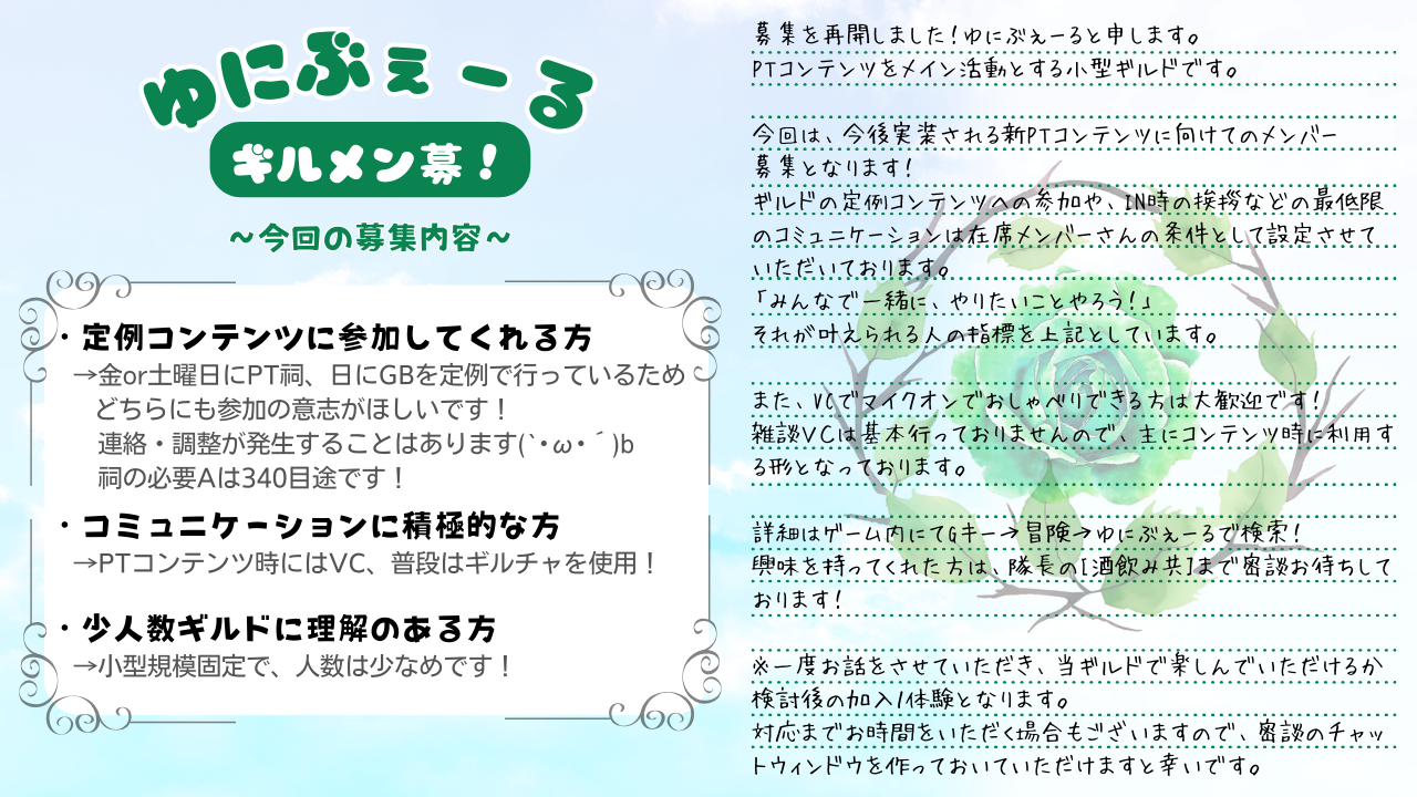 みんなで一緒に遊べるコトと、ここまでギルドについてきてくれる人を大事にしているギルドです。