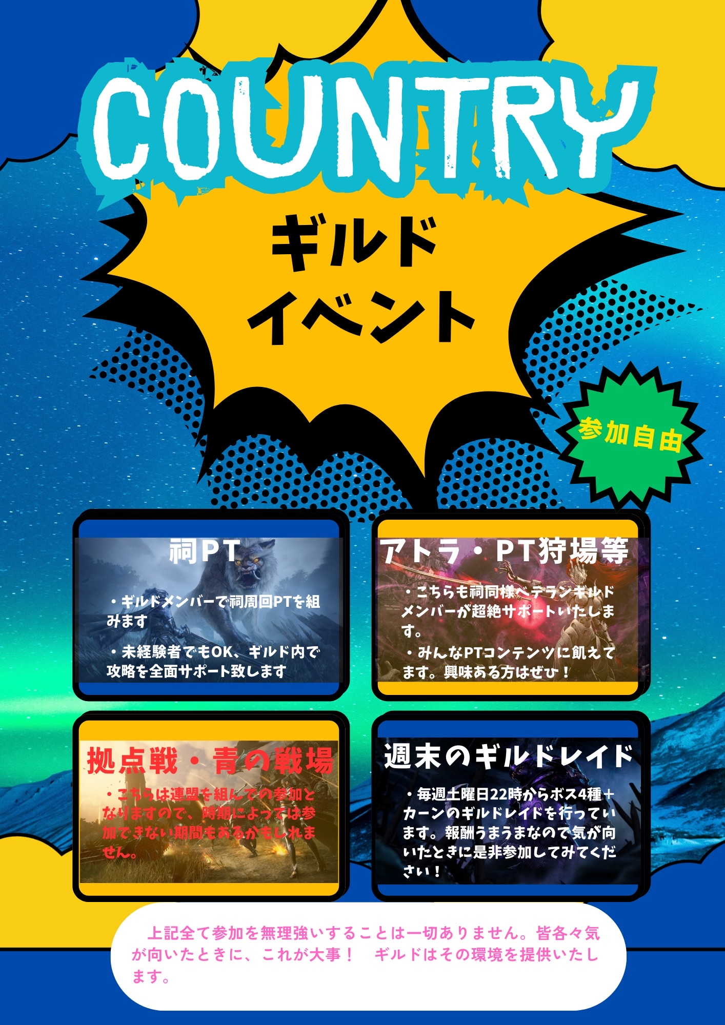 【COUNTRY】では一緒に初級拠点戦に参加してくれるギルド様を募集しております。