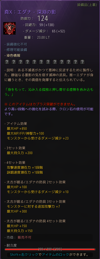 - 表記防御力 +2、使用効果にモンスターから受けるダメージ減少率 +1%、全ての抵抗 +2%を追加