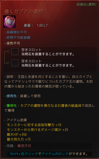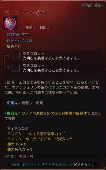 遺物は単体で装備するだけは最大の効果を発揮することはできませんが、任意の光明石を装着することで特殊なセット効果を得ることができます。赤色等級の遺物は遺物自体の効果も大きく、PvEでは「カブアの遺物」がモンスターに対する追加攻撃力とモンスターから受けるダメージ減少の効果で特に優れています。遺物と光明石は、エダニア地域で手に入るアイテムによりさらに強化することも可能です。