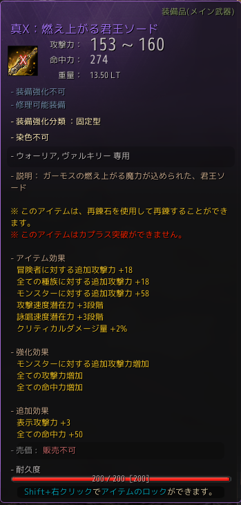 全ての命中力 +16 最大持久力 +100 バックアタックダメージ量 +6% |