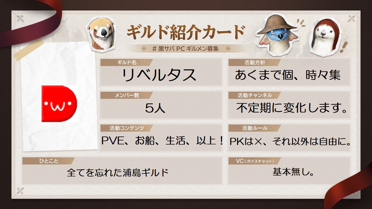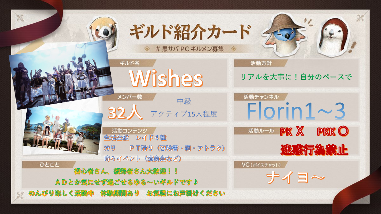 少数で楽しさを重視してるギルドです。今は少数なのでギルドコンテンツなかなか参加できないのですがいつか大型にしていろいろなコンテンツ参加していきたいです。