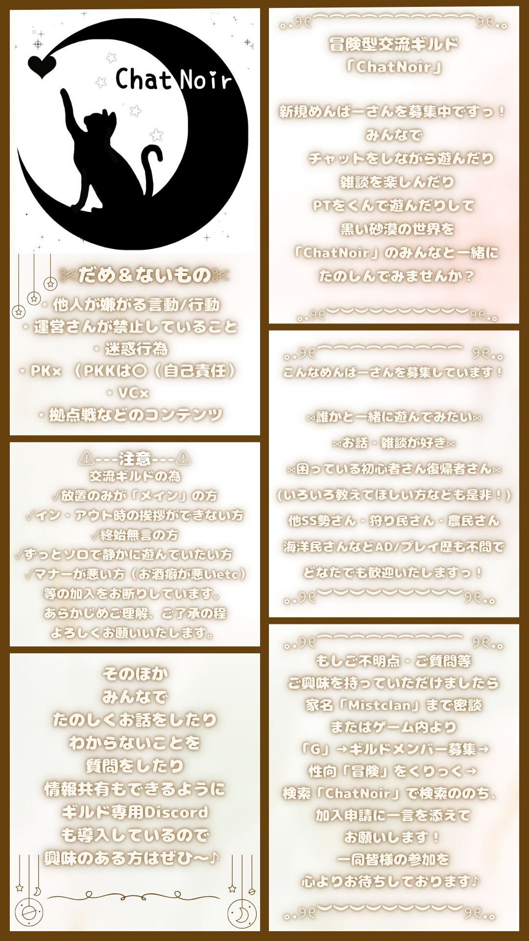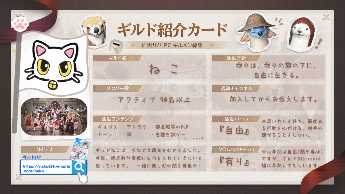 ギルド名は 猫のように自由に砂漠を楽しもうとの願いを込めてマスターが命名しました(*´ω`*) 気ままに過ごし、各コンテンツには 興味のある方同士ふらっと集まってくる公園のねこのようなメンバーさん達です(^^♪