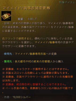 - 「マイメイド/執事衣装変更券」は、各大都市や村の終末の月管理人から購入できます。(1,000,000シルバー)