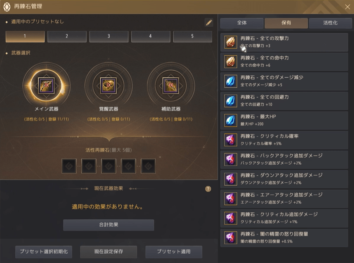 - 再錬石はメイン武器、覚醒武器、補助武器それぞれに登録する必要があり、スロットごとに再錬石を活性化する必要があります。