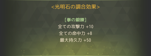 | 元:夜明けの水晶 - 全ての攻撃力 | 元:夜明けの水晶 - 闇の精霊の怒り | 元:夜明けの水晶 - 命中力 | |