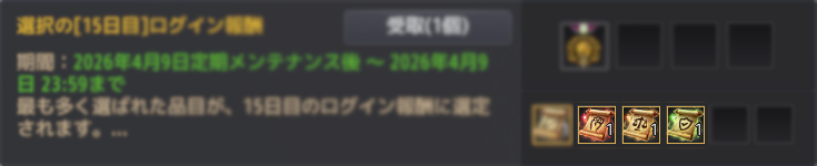確定した報酬は、15~28日目のログイン報酬として受け取れます。 |