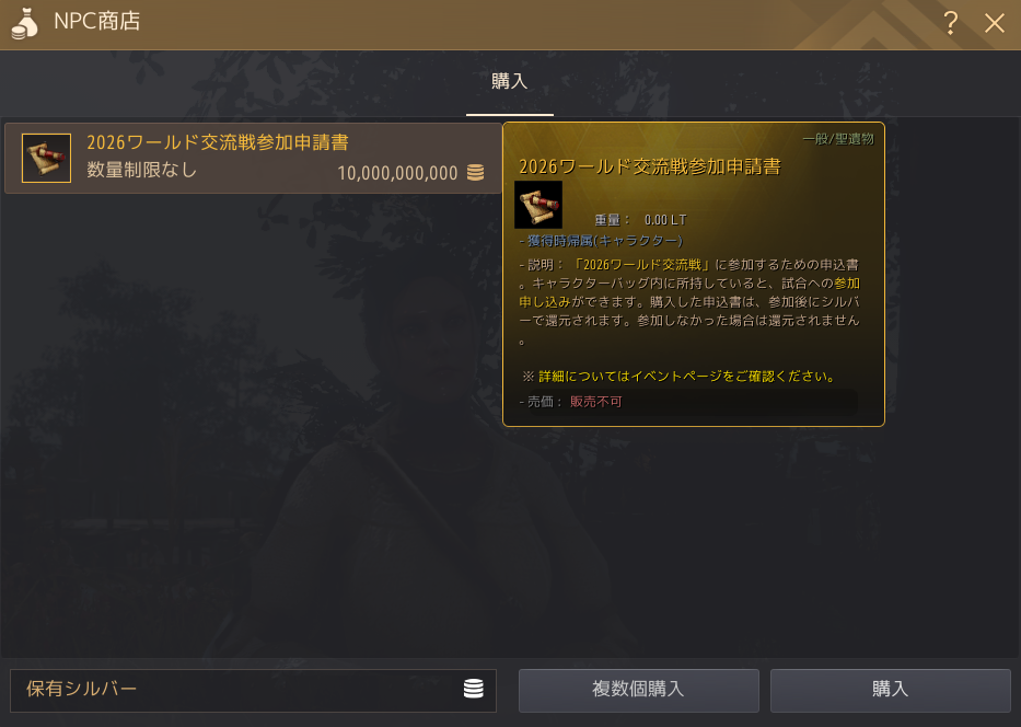 トライアルキャラクターで、「自由決闘場 - 1」にいるNPC「<2026ワールド交流戦>ヘルノ」から「2026ワールド交流戦参加申請書」を購入してください。