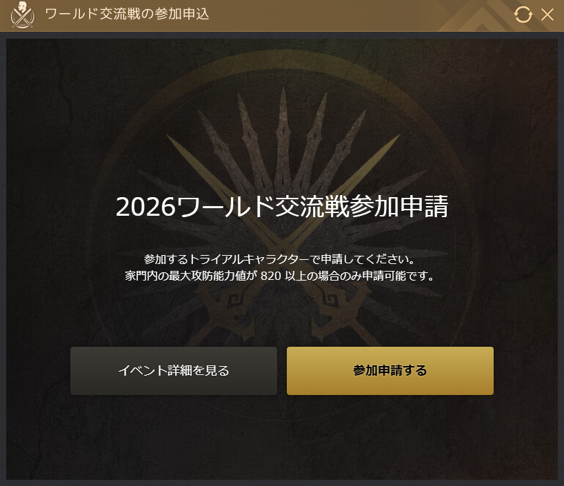 ・参加申請方法:ゲーム内で[メニュー(ESC) - 戦争 - ワールド交流戦の参加申込]を通じて参加申請