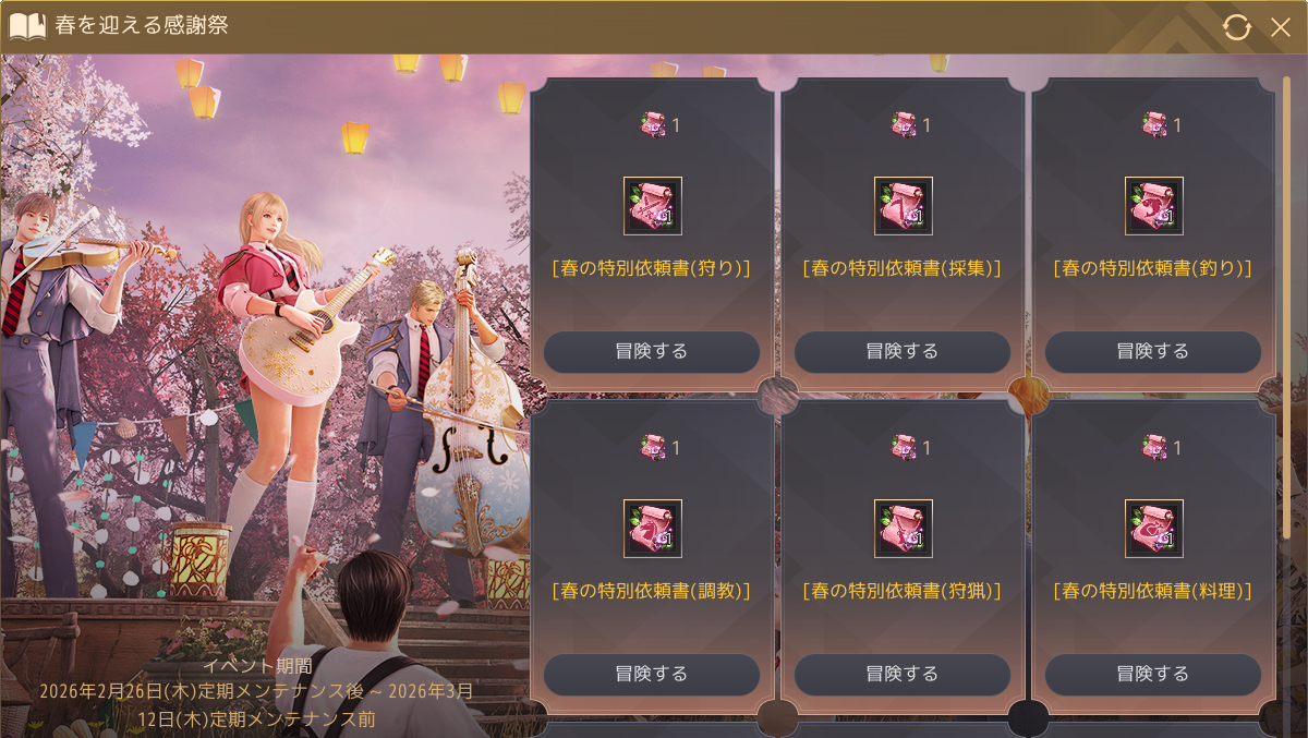 毎日、挑戦課題(Y)を通じて「[EV] 春の特別冒険券」を獲得し、春の特別依頼を達成すると獲得