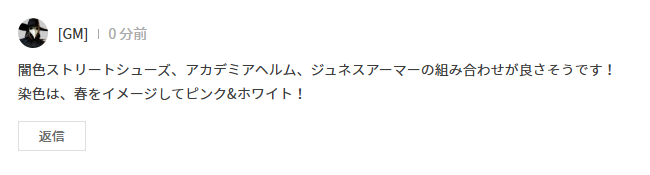 ② 本GMノートに闇色ストリート衣装の1部位と、それに組み合わせる他の衣装、染色情報を記入してコメントを登録してください。 |