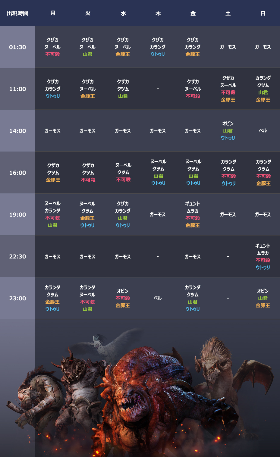 時間割 ワールドボス出現時刻表 ワールドボス出現時刻表 修正依頼をする 最近の修正日時 : 2025.12.04 12:45 共有する URLコピー Facebook X ※Olvia(オルビア)、Arsha(アルシャ)チャンネルを除く全チャンネルで出現します。※上記表内のワールドボスは通知と同時に出現します。 また、ワールドボス出現中はPVPが制限されます。 ※ワールドボス出現時間は今後の実施状況を鑑みて、 よりお楽しみ頂けるように開催スケジュール等を 変更させて頂く場合がございます。 その際は、ご案内の更新をさせて頂きます。 修正依頼をする 共有する URLコピー Facebook X