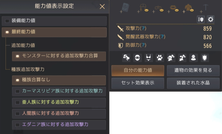 - 能力値表示設定の最終能力値フィルターのうち「種族追加攻撃力」-「種族合算なし」フィルターから、一般モンスターに適用される最終攻撃力を確認できます。