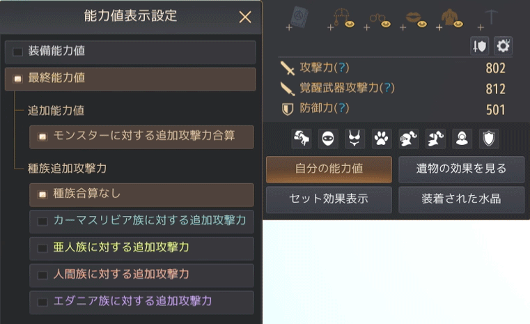 | 変更前の最終能力値の例 (「種族合算なし」を選択した場合、「全ての種族に対する追加攻撃力」の数値は含まれない) |