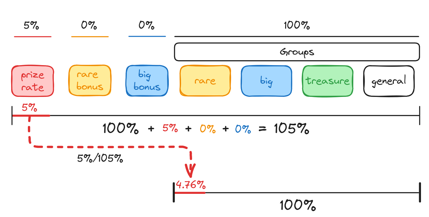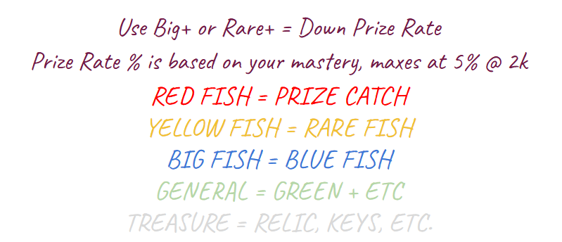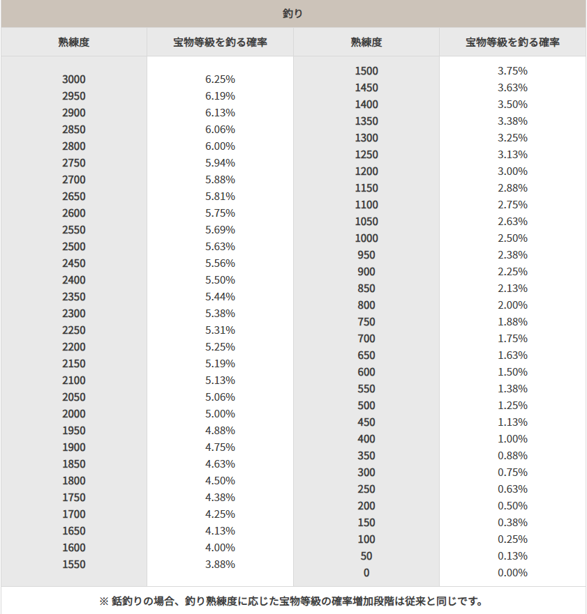 釣り熟練度に応じて宝物魚種の確率が変動する。