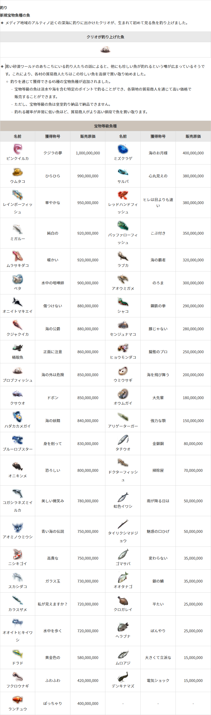 ・2024/11/14のアップデートにて、新規宝物魚種が追加されました。