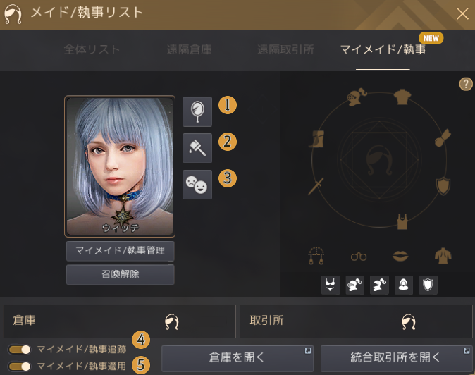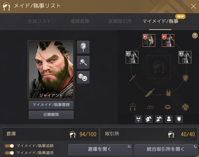 *「マイメイド/執事適用」を設定した状態で、倉庫管理や取引管理メイド/執事を召喚しても、一定時間が経過した際に召喚が解除されます。