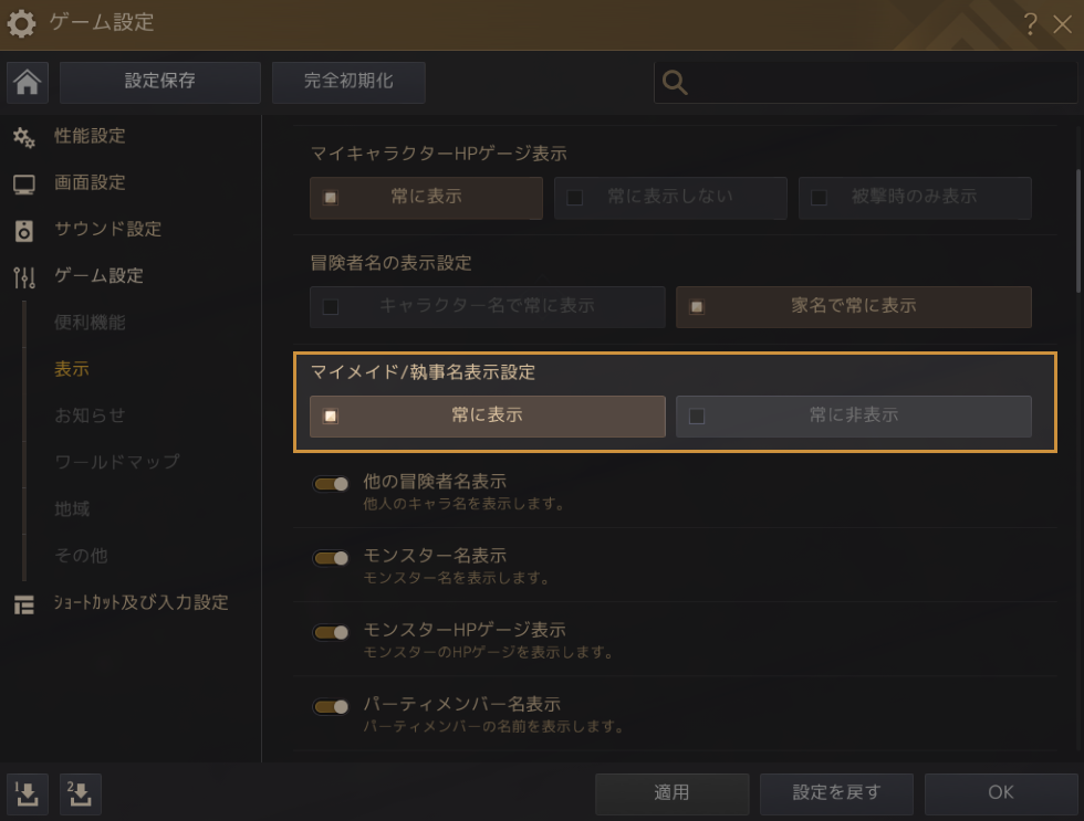 - [メニュー(ESC) - ゲーム設定]の表示カテゴリにある「マイメイド/執事名表示設定」を通じて変更できます。
