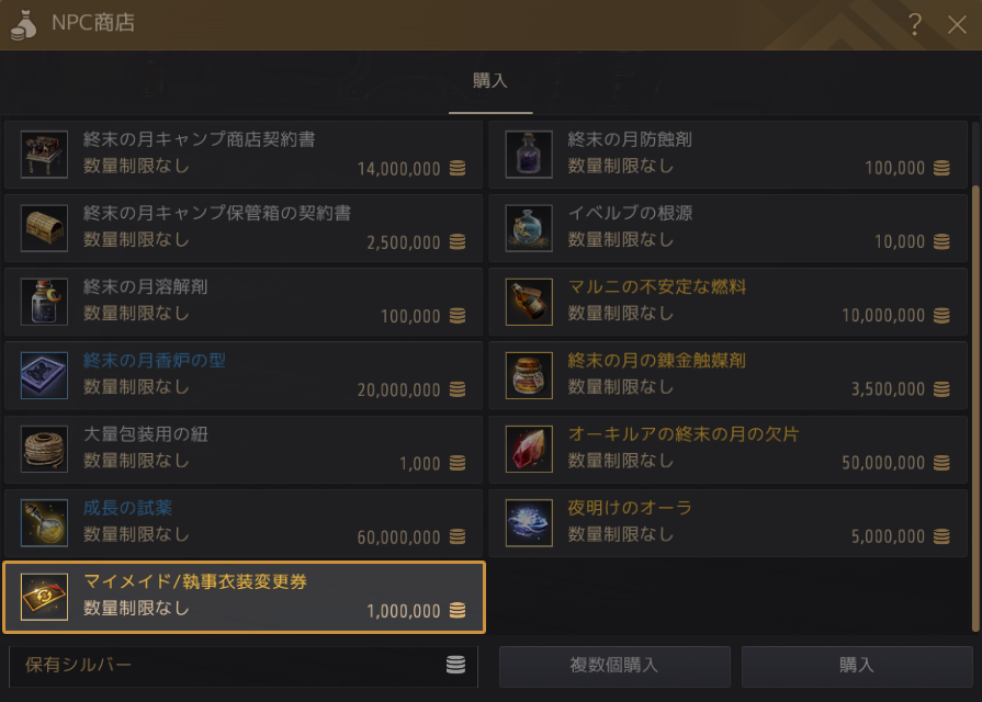 - 「マイメイド/執事衣装変更券」は、各大都市や村にいる<終末の月管理人>NPCの「終末の月商店」で購入できます。(1個当たり1,000,000シルバー)