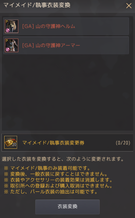 - マイメイド/執事専用衣装に変換した衣装はキャラクターが着用できなくなり、元のキャラクター用の衣装に戻すこともできません。